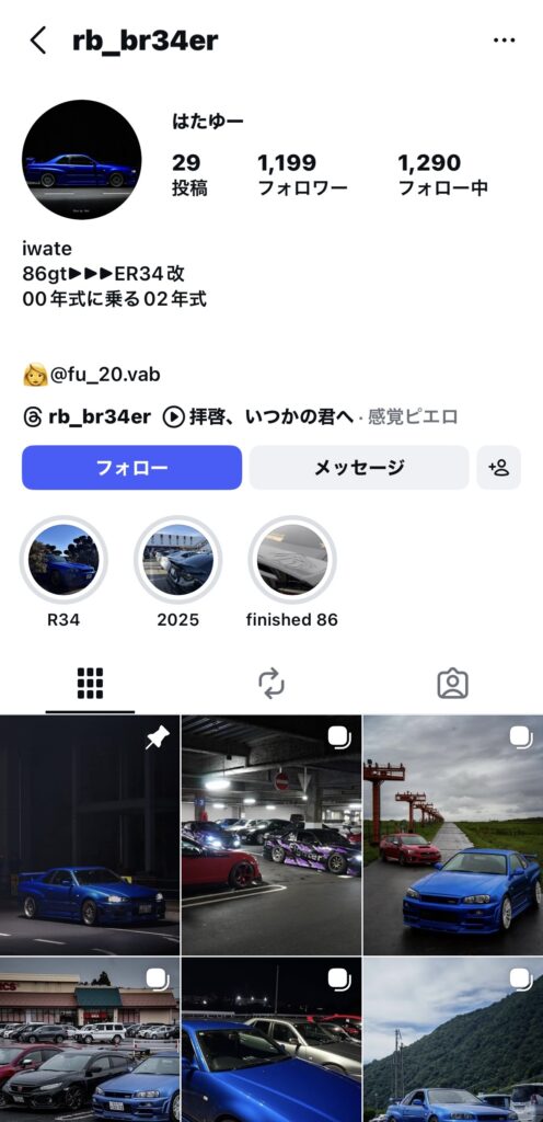 ・インスタグラムのアカウントはあり、車の写真を載せている