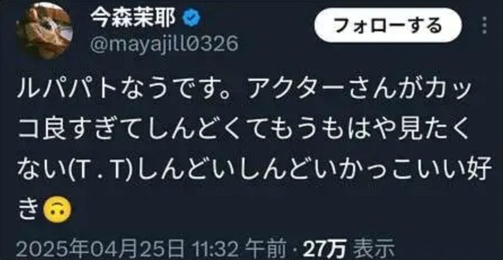 現在は削除されていますが今森さんがXで投稿した匂わせと言われる発言です。「アクターさんがカッコよすぎてしんどくて…」は浅井さんのことを言っているのでしょうか。