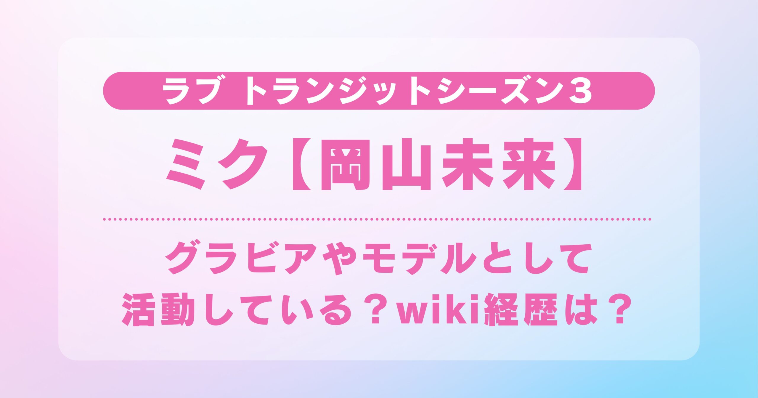 2025年10月16日にスタートする、Amazon Prime Videoの大人気恋愛リアリティ番組「ラブ トランジット」シーズン3。これに出演する「ミク」こと岡山未来さんは、グラビアや、TVCMなどのモデルとして活躍しているようです。詳しく調査しました。